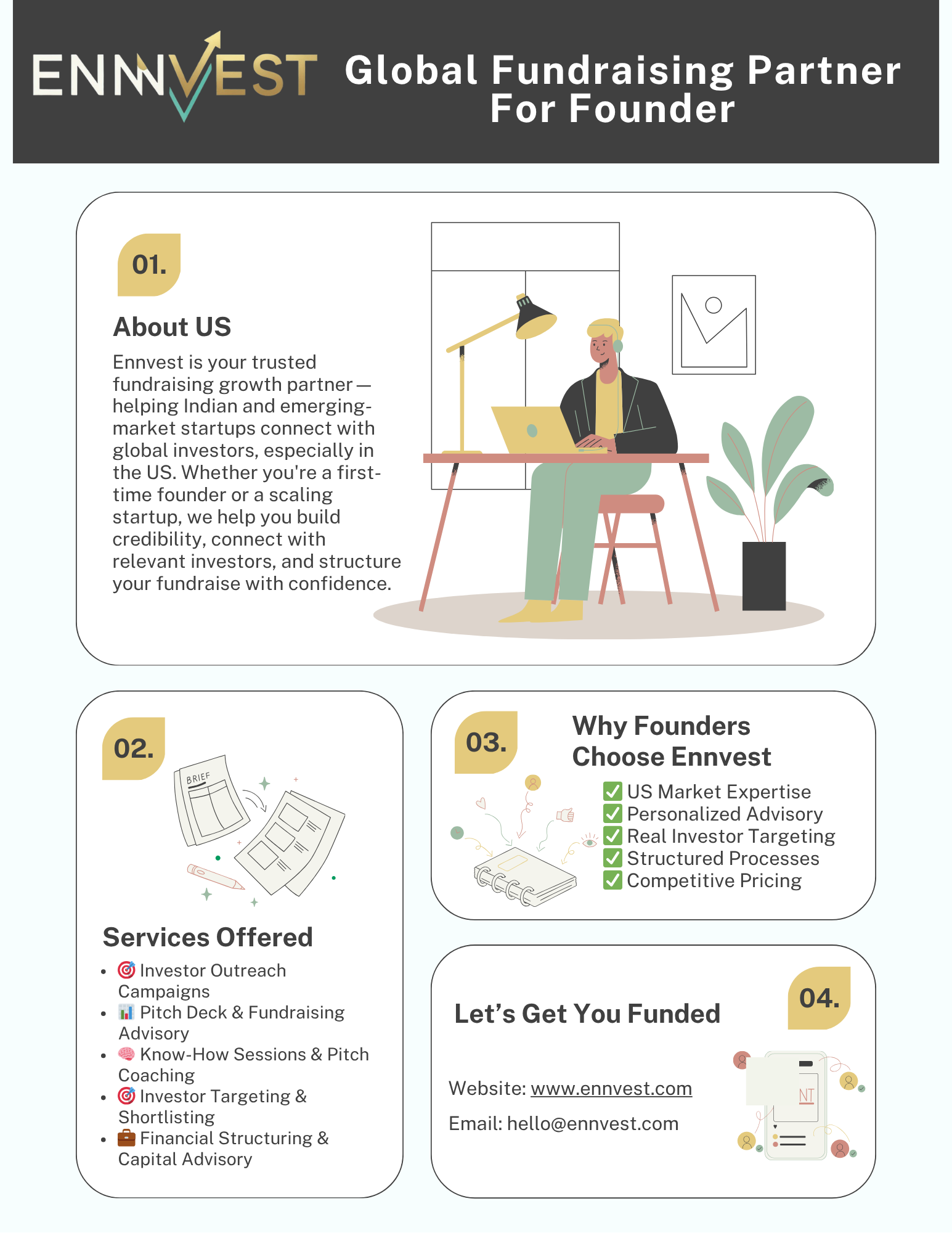 Ennvest is a smart fundraising partner dedicated to helping startups and founders raise capital efficiently. We combine deep expertise in fundraising strategy, investor engagement, and financial structuring with a personalized, hands-on approach. By working with a limited number of clients, we ensure tailored guidance, investor-ready materials, and strategic support at every stage of your fundraising journey. From seed rounds to growth capital, Ennvest empowers founders to raise capital confidently, faster, and smarter.